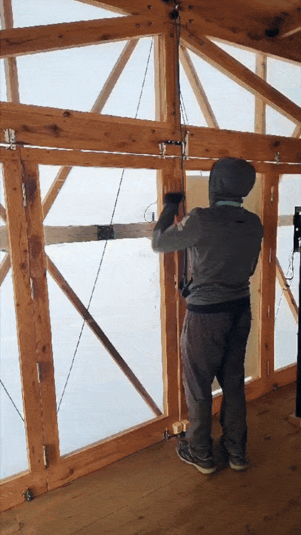 Mo.Ca. is constructed from locally sourced wood harvested from the forest surrounding Valldaura Labs. This wood was locally dried, cut, planed, and assembled into DLT (Dowel Laminated Timber) plates, using wooden dowels instead of glue, making the structure more sustainable. This method ensures structural integrity and minimizes the use of chemicals and adhesives.